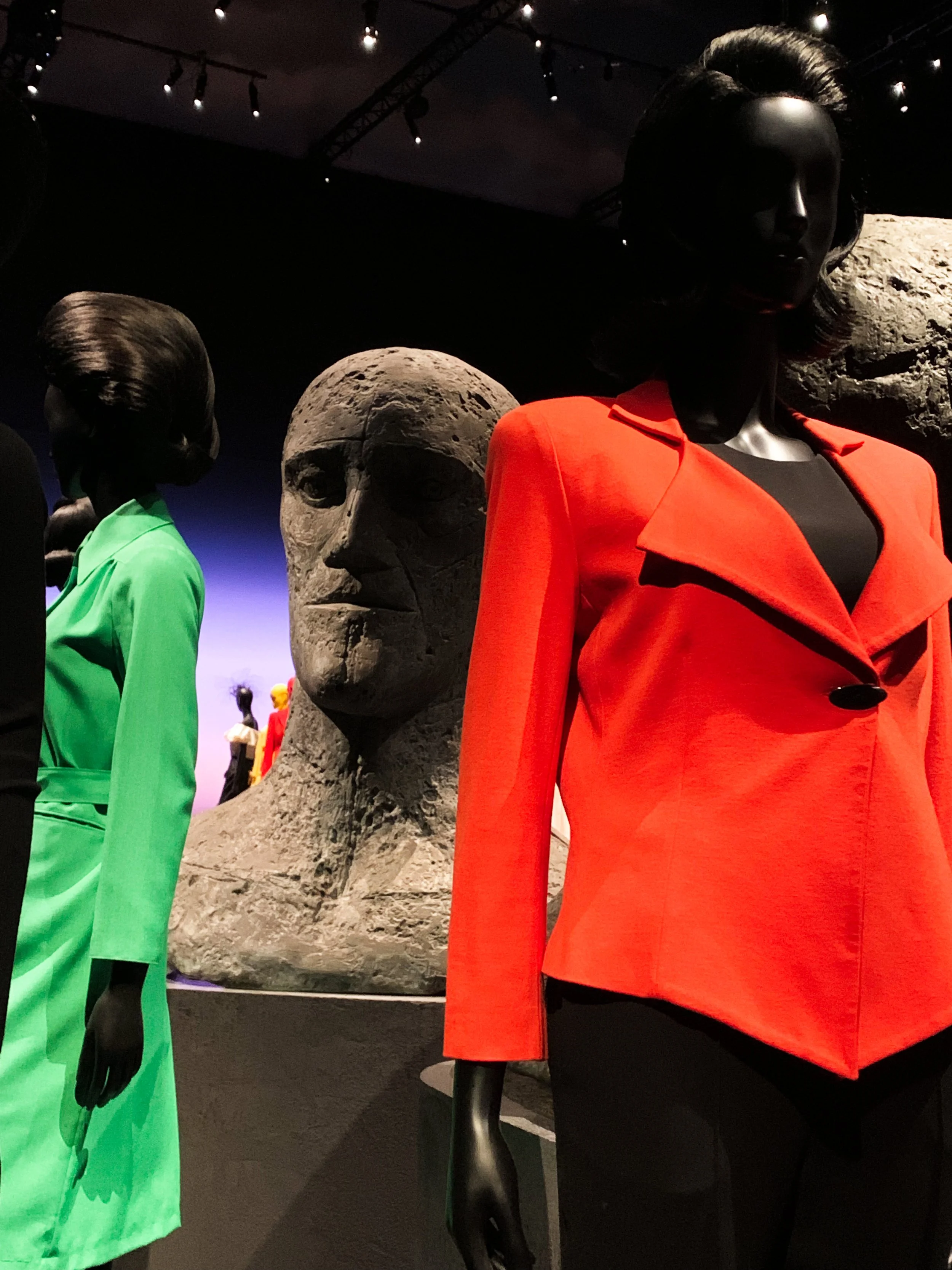 Painted in her signature colours black, cream, and red, the exhibition creates an atmosphere that reflects her timeless and sophisticated aesthetic. Raised on shiny plinths, garments are divided into themes draped over towering, uniquely designed mannequins. From her earliest pieces from the 60s, her collaboration with Ford, her iconic jumpsuit silhouette and distinct power dressing, each section memorialises a key part of her legacy.